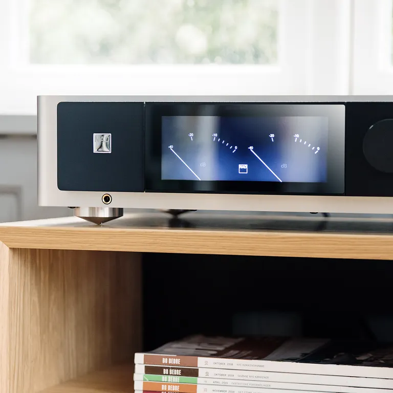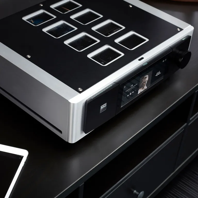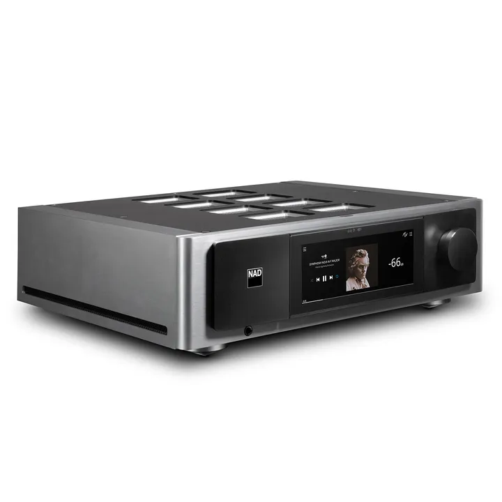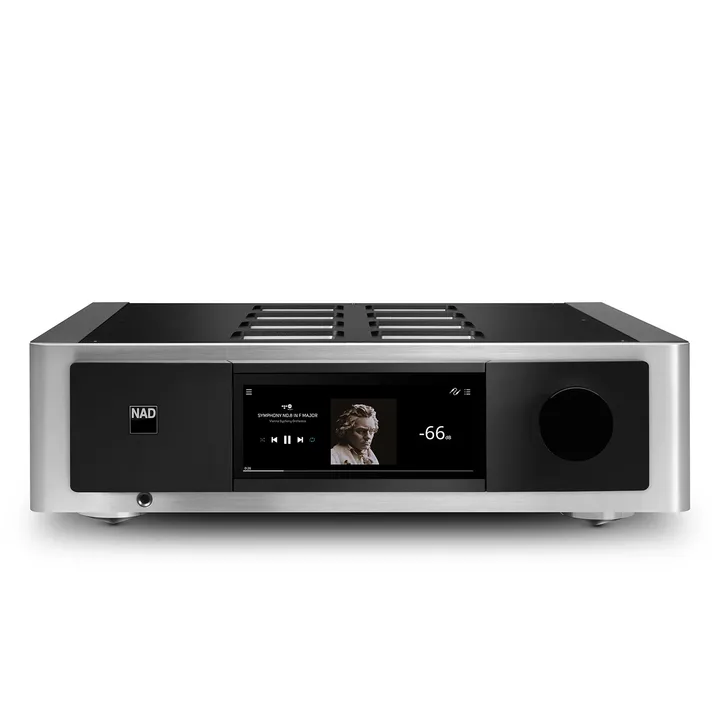 NAD M33 perustuu samaan upeaan massiiviseen alumiinimuotoiluun, jonka saatat jo tuntea muista Masters Series -tuotteista. Nautit uskomattoman hienosta 7" kosketusvärinäytöstä, kun käytät M33:ta suoraan laitteessa tai kun kuuntelet musiikkia suoratoistopalvelusta tai nettiradiosta Bluesoundin kautta. Tällöin saat albumitaidetta ja tietoja musiikkikappaleesta, artistista jne. suoraan paneelille.